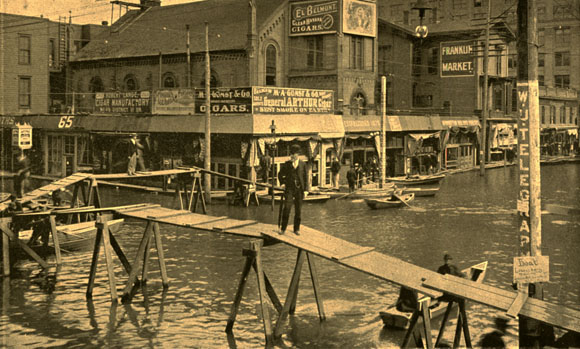Businesspeople try to carry on with life in a downtown Portland suddenly come to resemble Venice, during the famous flood of 1894. This image is from Third and Washington streets. (Image: Library of Congress)